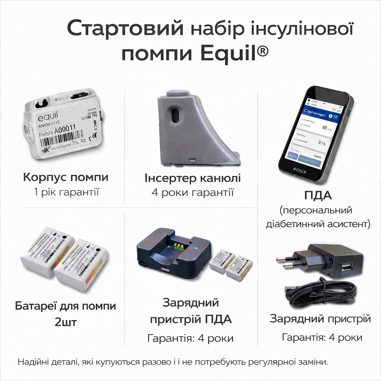 Інсулінова помпа Equil — це безтрубкова (patch) система подачі інсуліну, яка кріпиться на тіло та автоматично вводить інсулін протягом дня. Вона не має класичних трубок і керується через окремий пристрій (PDA).