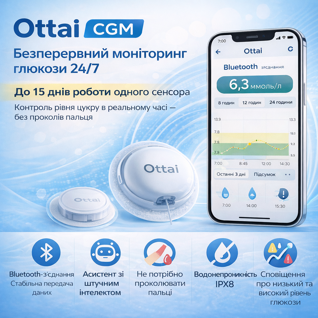 Ottai — це система безперервного моніторингу глюкози (CGM) нового покоління, створена для людей з діабетом, які хочуть бачити реальну картину рівня цукру 24/7 без постійних проколів пальця.