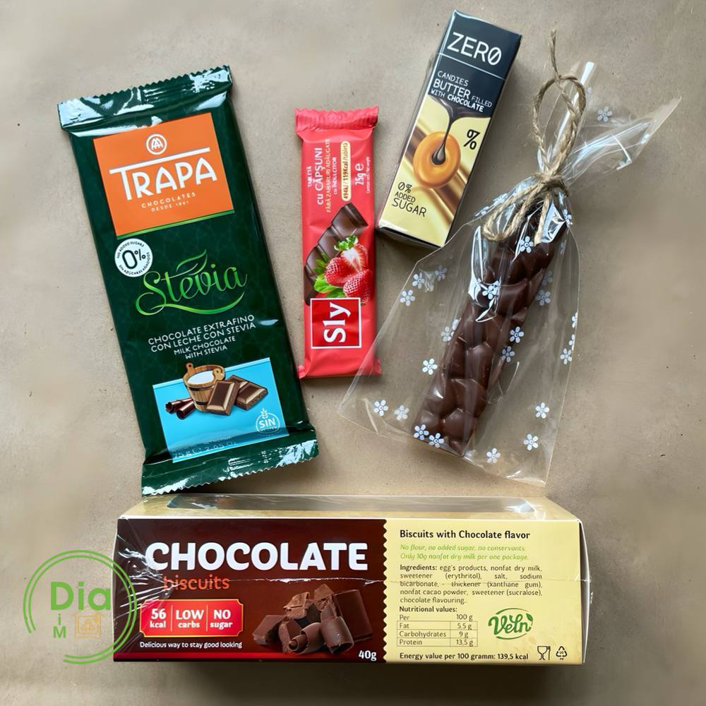 У наборі поєднані як солодкі плитки, так і перекус-формати: батончик SLy для енергії “на ходу” та хрустке шоколадне печиво Welln, яке ідеально смакує з кавою чи чаєм. Усі позиції мають знижений вміст цукру або не містять його зовсім, тому підходять людям із діабетом, тим, хто контролює споживання солодкого, або просто любителям “правильних” смаколиків.