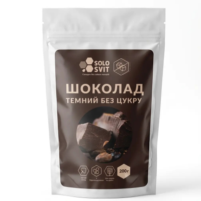 Темний шоколад SOLOSVIT не просто без цукру — він без ГМО, підходить для тих, кому важливо контролювати глікемію, дотримуватися low-carb чи кето-харчування, або просто не хочеться хардкорної солодкості в десерті.